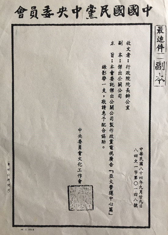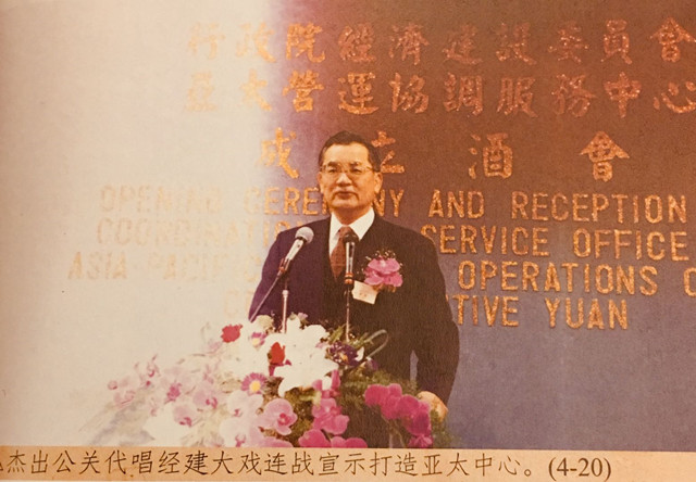 另又納入執政黨年度文宣重點工作,亦由國民黨中央文化工作會出面,函請行政院從政主管同志提供支援,旨在:「本會委託傑出公關公司,製作政黨電視廣告〈亞太營運中心篇〉錄影帶一支,敬請惠予配合協助」有案,時在1995年9月29日,大家都風光的黃金歲月,卻結束在岩里政男自毀長城下,千古罪人猶不自知罪孽如此重!現在仍等同僵屍般令人活見鬼?好人反而不長命還有什麼話說。