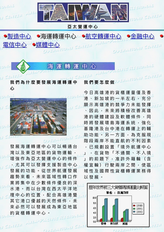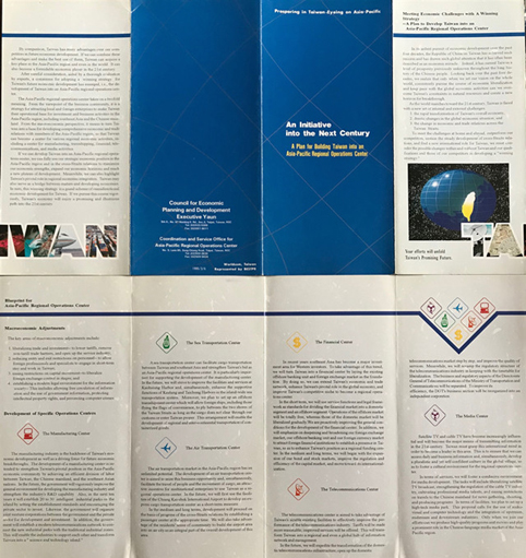 基於相當熟悉亞太營運中心(Asia-Pacific Regional OperationsCenter),主要內容與推動方向,而被時任行政院副院長、兼經建會主委徐立德倚重,授以負責媒體公關、及公共政策宣導業務,亦即專替中央政府,做整合行銷傳播工作。迨1993年春間此際,由我們團隊設計製作發行之、該中心計劃宣傳大小摺頁3式6種,與多媒體簡報中英文版各一支,均呈請經建會徐兼主委,親自審定後如期問世。