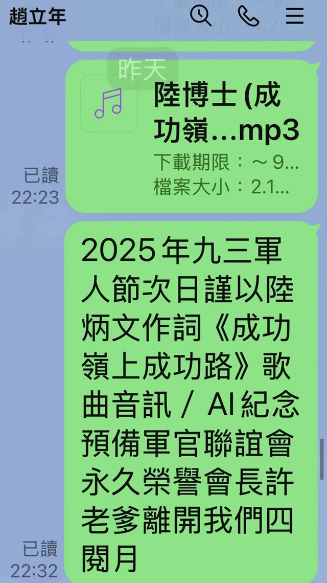 今歲2025年九三軍人節次日,預備軍官聯誼會會長、第15期政戰預官陸炳文博士,謹以詞作《成功嶺上成功路》歌曲音訊/AI分享軍文相關老友們,用來紀念預官會永久榮譽會長“許老爹”、高壽107歲的兩岸和平統一陣綫精神領袖許歷農(1919年4月4日~2025月4日)上將,離開我們四閱月;猶記得去(2024)年七七事變、對日抗戰的起點日前夕,媒體還以《誰喚醒沉靜三載〈成功嶺上成功路〉歌詞重新譜曲成功》為題,指出這位“誰喚醒”者就是他!