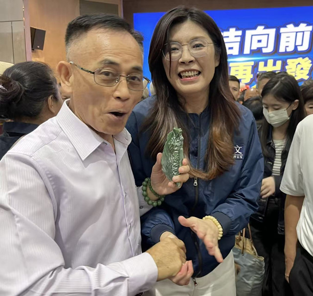 粥會新聞中心訊:受到全體粥友一致支持的鄭麗文,選上國民黨主席後一個星期,今(26)日第一次來到花蓮吉安國小活動中心,參加由花蓮縣黨部主辦之、「中國國民黨花蓮團結向前活動」,前大漢技術學院珠寶技術系創系主任蔡印來教授,代表粥友献上一份結緣品、寶島地形造型的臺灣玉飾,祈愿其明如天、其堅實如山水,而生捍衛正義之能量,甚得鄭主席喜歡而笑納,共祈天佑臺灣、天佑中華大地。據蔡教授介紹:中國人向以玉、視為天地正氣之精華,形狀各異的玉器,常被用作人神交流的媒介,因此寶玉在崇拜、和通往精神世界中的作用,使其成為生死不可或缺的寶物。臺灣玉主要產地,位於東台灣花蓮縣豐田地區的、蛇紋岩和黑色片岩之接觸帶,有些閃玉的纖維狀結晶,呈平行方向排列,經打磨後具有貓眼效應,故亦可稱之為貓眼閃玉。